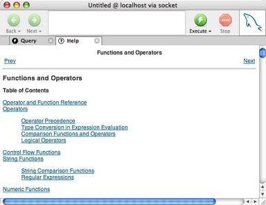 Enfin, le MySQL Query Browser est un assistant de création de requêtes qui permet, globalement, trois actions complémentaires : naviguer dans les bases de données du serveur MySQL, accéder à la bibliothèque de fonctions et, enfin, obtenir une aide complète sur la syntaxe des requêtes. Le système d’édition permet évidement test est sauvegarde à la manière de formule de tableur.