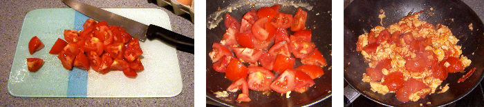 Lavez vos tomates, coupez-les en deux, enlevez le reste du pédoncule et finissez de les couper en quinconce. Il faut que vous obtenir de morceaux assez généreux,mais irrégulier. Une fois les tomates coupées, mmettez-lesdans le wok, à feu vif, et llaissez-lejuste prendre uunpetit peu avant d’y remettre vos ooeufs